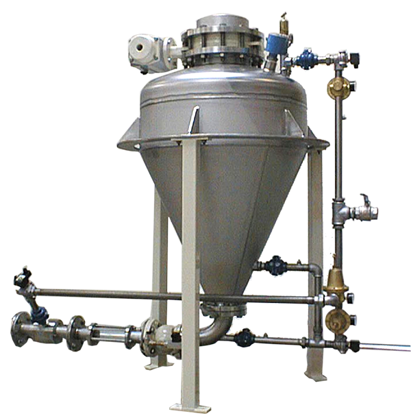 打開進氣閥,壓縮空氣進入泵體上部及底部,上部加壓,下部空氣擴散后穿過流化床,使物料呈流態(tài)化狀態(tài),同時泵體內(nèi)壓力上升;