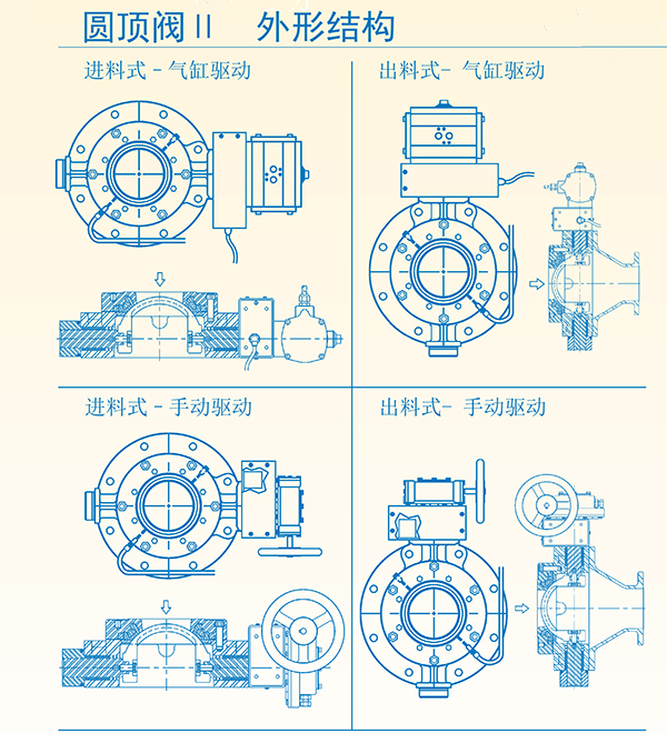 全口徑無(wú)阻礙的物料流動(dòng)是通過(guò)獨(dú)特的球頂設(shè)計(jì)來(lái)實(shí)現(xiàn)的,僅僅轉(zhuǎn)動(dòng)90°機(jī)殼實(shí)現(xiàn)閥門從全閉到全開狀態(tài)的切換。這一操作使整個(gè)球頂在轉(zhuǎn)動(dòng)過(guò)程中通過(guò)物料得到清理。