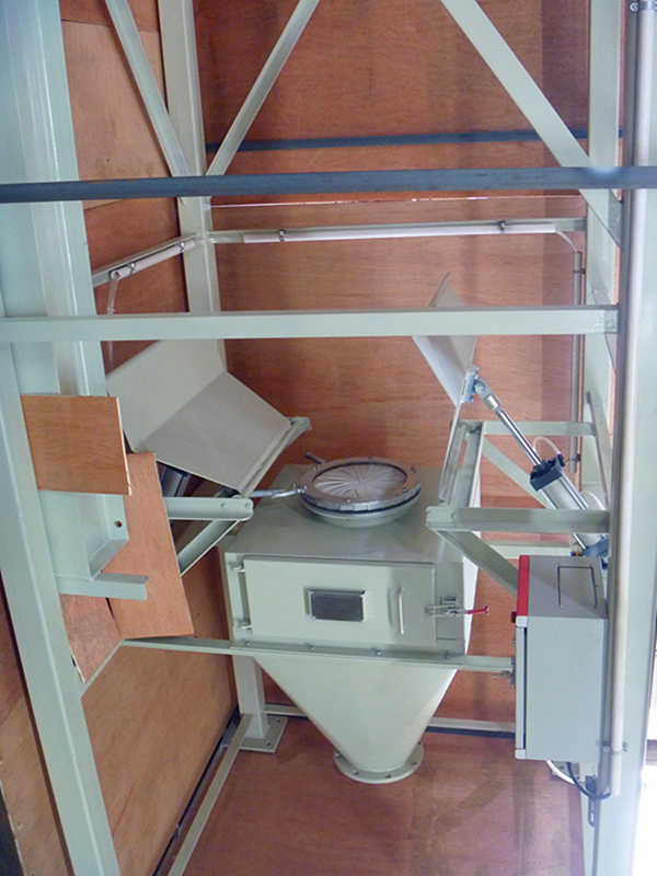 下料倉(cāng):上部配有圓形變徑可使物料袋下料口更好的對(duì)準(zhǔn)料倉(cāng)中心并加快物料下落速度。中間部分配有手動(dòng)解繩的工作門。下部與目標(biāo)倉(cāng)法蘭連接(也可增加橡膠軟連接與目標(biāo)法蘭對(duì)接)。